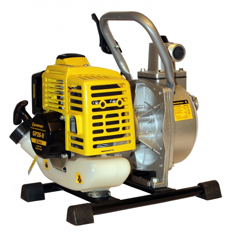 Обновленная двухтактная мотопомпа Champion GP26-II пришла на замену снятой с производства GP25-II. В целом это всё та же компактная легкая помпа, работающая с производительностью до 130 л/мин. Она пригодится на даче, в саду, да и в любых местах, где необходимо откачивать воду.