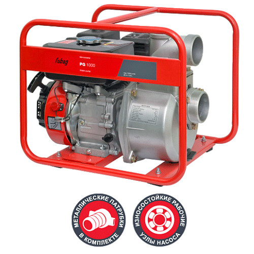 Мотопомпа бензиновая FUBAG PG 1000 применяется для откачки воды во время весенних половодий, из прудов и колодцев, подвалов и погребов. Способна перекачивать до 1000 литров воды в минуту. Диаметр твердых частиц в жидкости не должен превышать 4 мм. Конструкция заключена в металлическую раму - для лучшей устойчивости и надежности. Мощный двигатель обеспечивает передачу воды на расстояние до 26 метров.