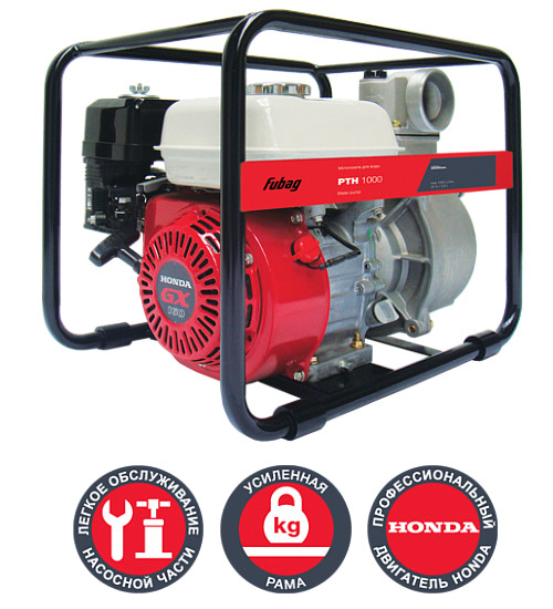 Мотопомпа для чистой воды FUBAG PTH 1000 может быть использована для организации системы орошения на садовом участке, осушения бассейна перед похолоданием. Агрегат оборудован надежным двигателем HONDA GX160 мощностью 4.8 л.с. Рамная конструкция защищает составные элементы от механических повреждений и облегчает транспортировку. Рабочее колесо и улита изготовлены из чугуна.