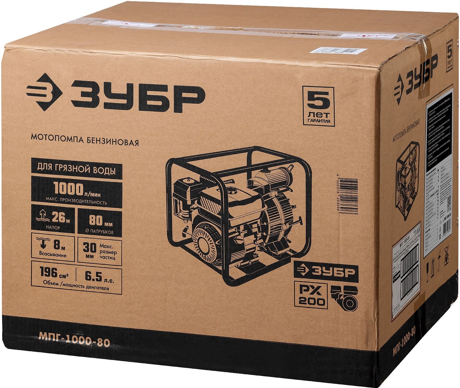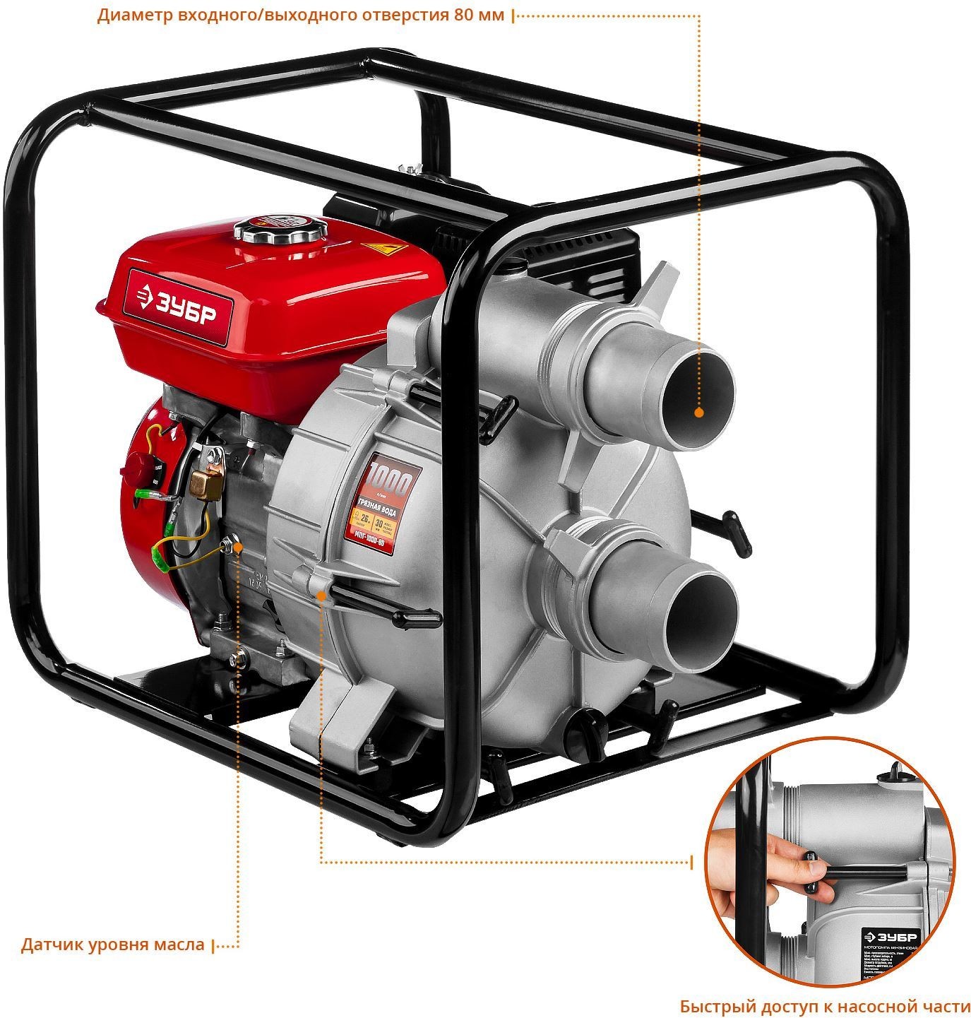 - Продолжительная работа. Вместительный топливный бак объемом 3.6 л гарантирует продолжительную непрерывную работу мотопомпы Зубр МПГ-1000-80