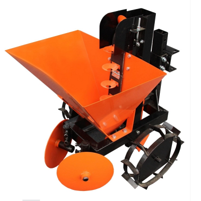 Картофелесажалка для мотоблоков используется для посадки картофельных семян на установленную глубину. Вместе с посадкой этот агрегат одновременно заделывает почву и формирует почвенные гребни нужной высоты. Представленная модель агрегатируется с легким, средним и тяжелым типом мотоблоков. Выбор мотоблока осуществляется в зависимости от состояния почвы, на которой будет произведена посадка картофеля. Картофелесажалка подсоединяется к мотоблоку с помощью специального крепления, которое входит в комплект. В процессе эксплуатации важно, чтобы мотоблок был обеспечен надежным сцеплением привода, для этого необходимо установить на агрегат металлические колеса с грунтозацепами. Для установки картофелесажалки на мотоблок нужно провести следующие действия: установить на ровную площадку картофелесажалку с мотоблоком таким образом, чтобы рама мотоблока находилась параллельно площадке картофелесажалки. Сцепку картофелесажалки следует переместить к сцепному устройству мотоблока, и зафиксировать их между собой. Для того, чтобы установить глубину посадки семян нужно ослабить болт, опустить корпус картофелесажалки на необходимую глубину и затянуть болт. Высота регулируется путем увеличения угла атаки. При эксплуатации картофелесажалки следует соблюдать ряд определенных правил. Нельзя использовать данное оборудование в местах, где имеются залежи, каменистая почва, а также там, где картофелесажалку можно повредить о корни кустарников или деревьев. Запрещено при использовании картофелесажалки включать задний ход на мотоблоке. Перед работой следует убрать с рабочего участка посторонние предметы, тщательно проверить исправность картофелесажалки, насколько надежно зафиксированы соединения. Устранить неисправность и настроить картофелесажалку можно только при выключенном моторе мотоблока. После окончания работ нужно очистить картофелесажалку, обработать все детали и резьбовые соединения специальной смазкой, кроме тех составляющих, которые имеют лакокрасочное покрытие. Картофелесажалку следует хранить в закрытом помещении. Картофелесажалка малогабаритная предназначена для посадки семенного картофеля на выбранную глубину с одновременной заделкой в почву и образованием почвенного гребня по необходимой высоте согласно выбранной Вами агротехнологии. Возможна комплектация картофелесажалки туковысевающим аппаратом для одновременного, с посадкой картофеля, внесения в рядки минеральных удобрений. Агрегатируется с мотоблоками среднего и тяжелого типа отечественного и импортного производства. При использовании картофелесажалки малогабаритной на легких почвах возможно использование мотоблока легкого типа (мотоблок приобретается отдельно)